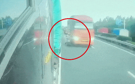 ▲电动车在两辆大货车中间超车,被大货车撞倒。