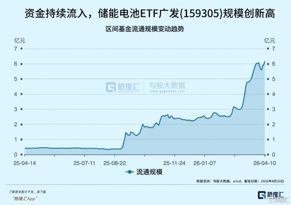 截至4月10日,储能电池ETF广发(159305)近20个交易日合计净流入2.45亿元,近一年合计净流入5.38亿元,最新规模6.16亿元,创历史新高。