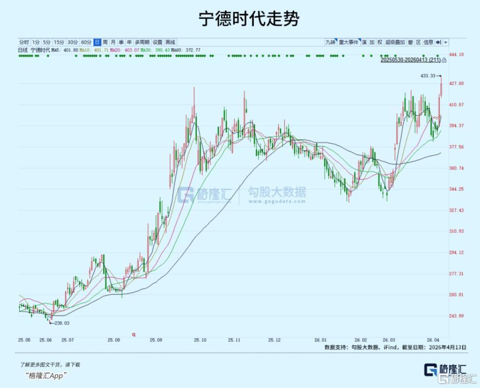 本日最为瞩目的无疑是行业龙头宁德时代。该股在A股盘中强势拉升,最高触及433.33元/股的历史新高,总市值逼近2万亿元,截至收盘录得2.68%的显著涨幅。