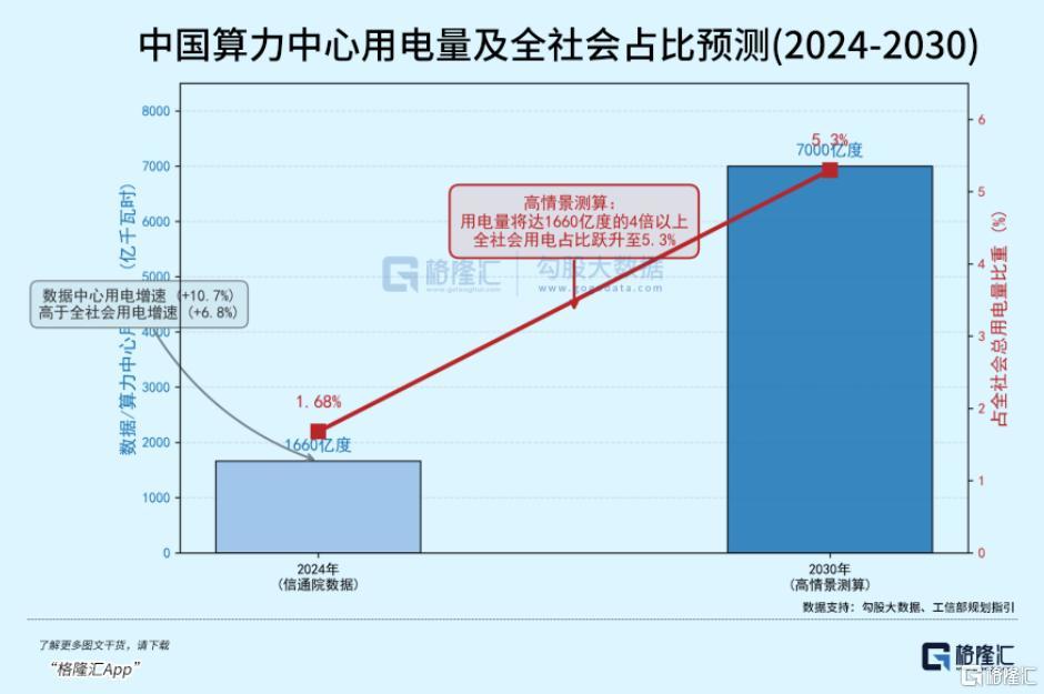 与此同时,Token经济对电力的吞噬效果显著。据中国信通院数据,2024年全国数据中心用电量超过1660亿千瓦时,约占全社会总用电量的1.68%,用电量同比增长10.7%,而同期全社会总用电量的增速为6.8%。据测算,高情景下,到2030年中国算力中心用电或超过7000亿千瓦时,占全社会用电量5.3%。