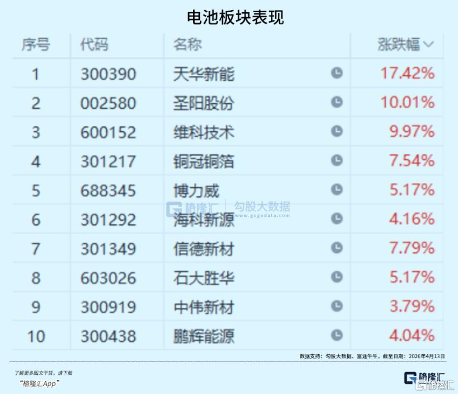 回到今天盘面,在龙头股的示范效应下,电池板块内的中小盘及高弹性标的同样表现亮眼。